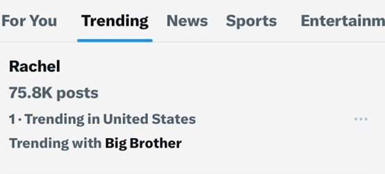 事实证明,节目组不敢开lfs,卡在美西9点美东12点回来,where is Rachel立刻冲上热搜,Rachel更是全美热搜第一。