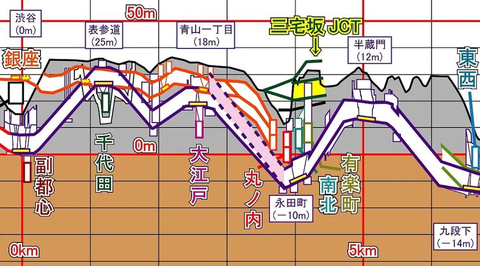 实际上这两个线路施工的时候就不在一个高度。銀座線较浅,开通于1927年;半蔵門線较深,开通于1978年。修建后者的时候,因为銀座線外苑前駅附近和上方都没有空间,只能考虑在下方设站的方案,但是因为施工费用大大增加,最后干脆选择不设此站。