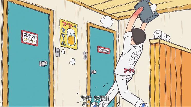 回到具体情节,还能发现石立监督偏爱的剪辑方式——“动作顺接”。这虽是剪辑基础,但与真人电影、漫画相比仍有差异:真人电影受限于空间,需要在有限范围内摆放多台摄像机;漫画则喜欢用一个个分镜框,将角色“困”在画面中。而动画没有这些限制,比如某个“从俯视到仰视”的镜头:通过视角转化增加画面纵深,为后续“角色将物品投掷到另一个房间”的动作增强力度,既突出了角色的疼痛程度,又将其转化为笑果。这种分镜是动画独有的,也能看出,相较于那些擅长借鉴电影的“影迷监督”,石立太一的创作灵感,更多来自自身高超画技带来的“动画师视角”。