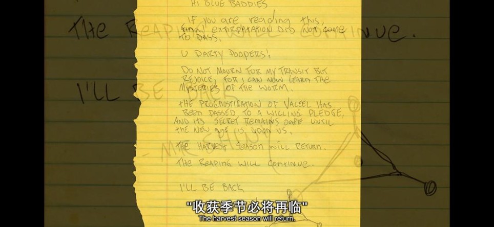 还有一个不容忽视的细节,电影里莱斯利·赛克斯喜欢给警局寄手写信,自然而然,熟悉恐怖片的大家都能想到了历史上著名的黄道十二宫杀手,他也喜欢给警局寄信,或骚扰或嘲讽,但警察就是找不出来这个人是谁。如果对黄道十二宫杀手感兴趣的可以去看看大卫·芬奇的《十二宫》也可以看看近几年Netflix新出的纪录片《黄道杀人魔再揭秘》。